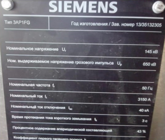 Новый элегазовый выключатель Siemens 3AP1FG 145 кВт, 3150 А/40 кА, 2013 года, 1 штука.